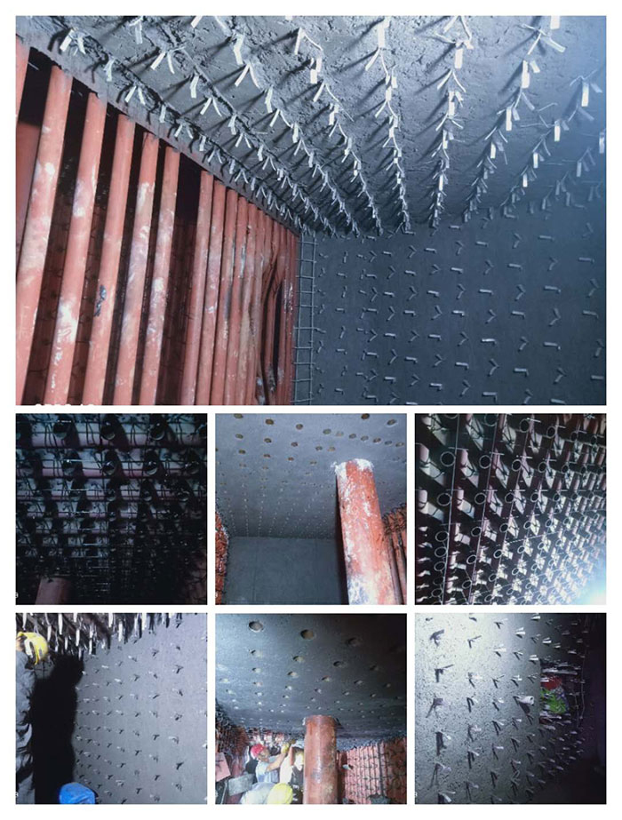 a. 可塑料的質量檢查① 可塑料烘干后,用半磅錘輕輕敲擊襯里,襯里應發出清脆回聲,襯里無疏松及無凹凸現象。② 襯里烘干后,表面應平整、無麻面、無明顯裂紋。b. 可塑料的修補方法① 襯里任一缺陷部位進行修補時,應將襯里鑿成外小內大狀,修補的小規模范圍至少包括5個保溫釘(銷釘)的范圍(至少為300×300mm),并且在四周用水濕潤。②所有修補工作應采用和原來施工相同的方法進行。九、可塑料的驗收可塑料施工驗收時,應提交下列技術文件:a. 材料合格證明書b. 材料工程試塊試驗(測試)報告(權威部門檢測報告)c. 隱蔽工程驗收記錄d. 質量檢查及修補記錄