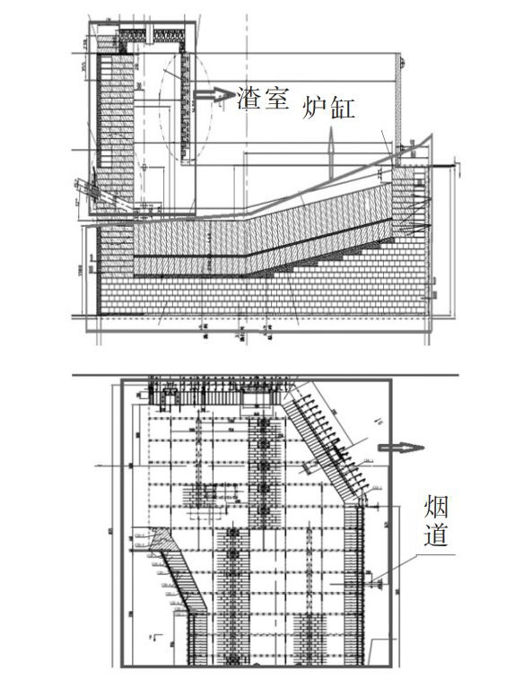 由側吹爐工作原理可知,側吹爐爐缸、渣室會受到熔體的侵蝕和沖刷,煙道會受少量熔渣的噴溉侵蝕和含塵煙氣的沖刷。在正常爐況下,這3個區域的溫度為1100~1300℃;但在爐況不穩定情況下,這3個區域的溫度可達1400℃以上。在實際生產過程中,側吹爐需供入富氧1次風和2次風,并在局部形成強氧化氣氛,因此側吹爐應選擇不易被氧化的耐火磚。熔渣的主要成分為FeO、SiO?、CaO、AI?O?,高鋁質耐火材料和硅石耐火材料會參與造渣,不適合側吹爐使用。因此,側吹爐耐火材料需要具備耐高溫、熱穩定性強、荷重變形溫度高、耐壓強度高、抗氧化性、不參與造渣的特點。結合耐火材料的特性,側吹爐應選擇鎂質耐火材料。鎂質耐火材料中Cr?O?的含量増加可以提高材料的抗渣侵蝕性,因此側吹爐爐缸、渣室和煙道的耐火磚選擇Cr?O?含量較高的鎂鉻質耐火材料。