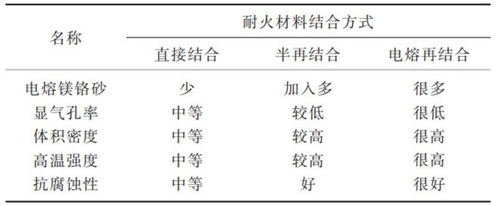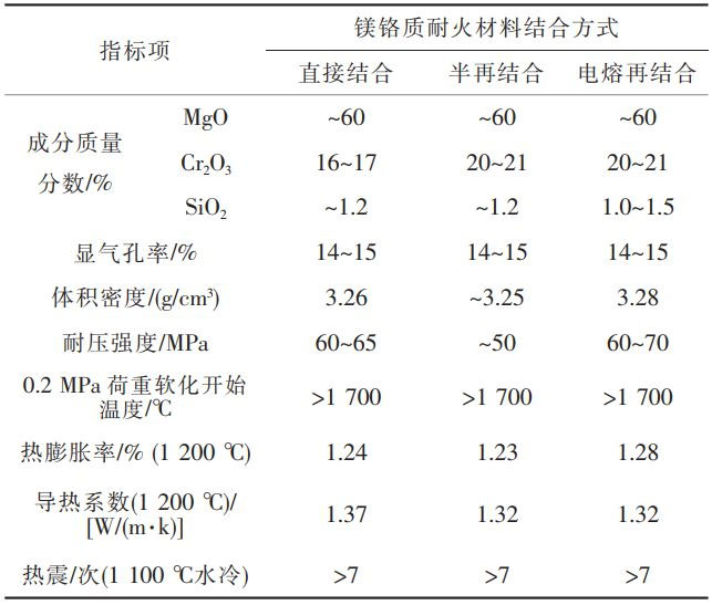 根據鎂鉻質耐火材料的結合形式的不同,包括直接結合、半再結合、電熔再結合等鎂鉻質耐火材料。其中,直接結合鎂鉻質耐火材料是以高純燒結鎂砂和鉻鐵礦為原料,將電熔鎂砂與鉻礦直接燒結;半再結合鎂鉻質耐火材料是以電熔鎂鉻砂作屬粒,加入部分鉻礦和鎂砂或燒結合成鎂鉻料作細粉,高溫燒結而成;電熔再結合鎂鉻質耐火材料是將鉻礦與電熔鎂砂在電爐中電熔,制得電熔鎂鉻砂,再高溫燒結而成。3類鎂鉻質耐火磚材料特性對比,見表1。