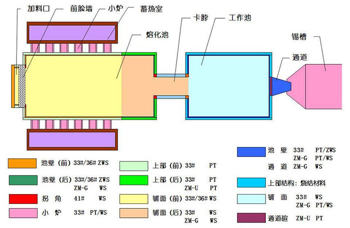 為了減少死角,以利于玻璃液的流動,我們將熔化池的前池墻磚體設(shè)計為八字形。